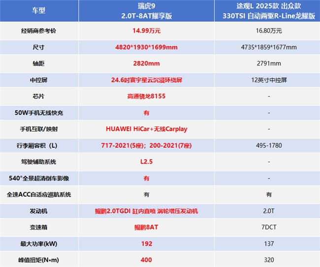 隨著越來越多的用戶逐漸傾向于全家出行,大家對車輛的要求也從“能開就行”轉(zhuǎn)向“好開好用”。當(dāng)家庭用戶開始要求座駕擁有“伙伴”屬性,更大、更智能、更強悍的中型SUV就成了更符合期待的選擇。在15萬左右的價位,什么樣的中型SUV才能全面滿足家庭用戶的多樣化用車需求?接下來,我們就以瑞虎9 2.0T-8AT耀享版(以下簡稱:瑞虎9)以及途觀L 2025款出眾款330TSI自動兩驅(qū)R-Line龍耀版(以下簡稱:途觀L)兩款熱門SUV為例,一起盤點下用戶最需要哪些配置。